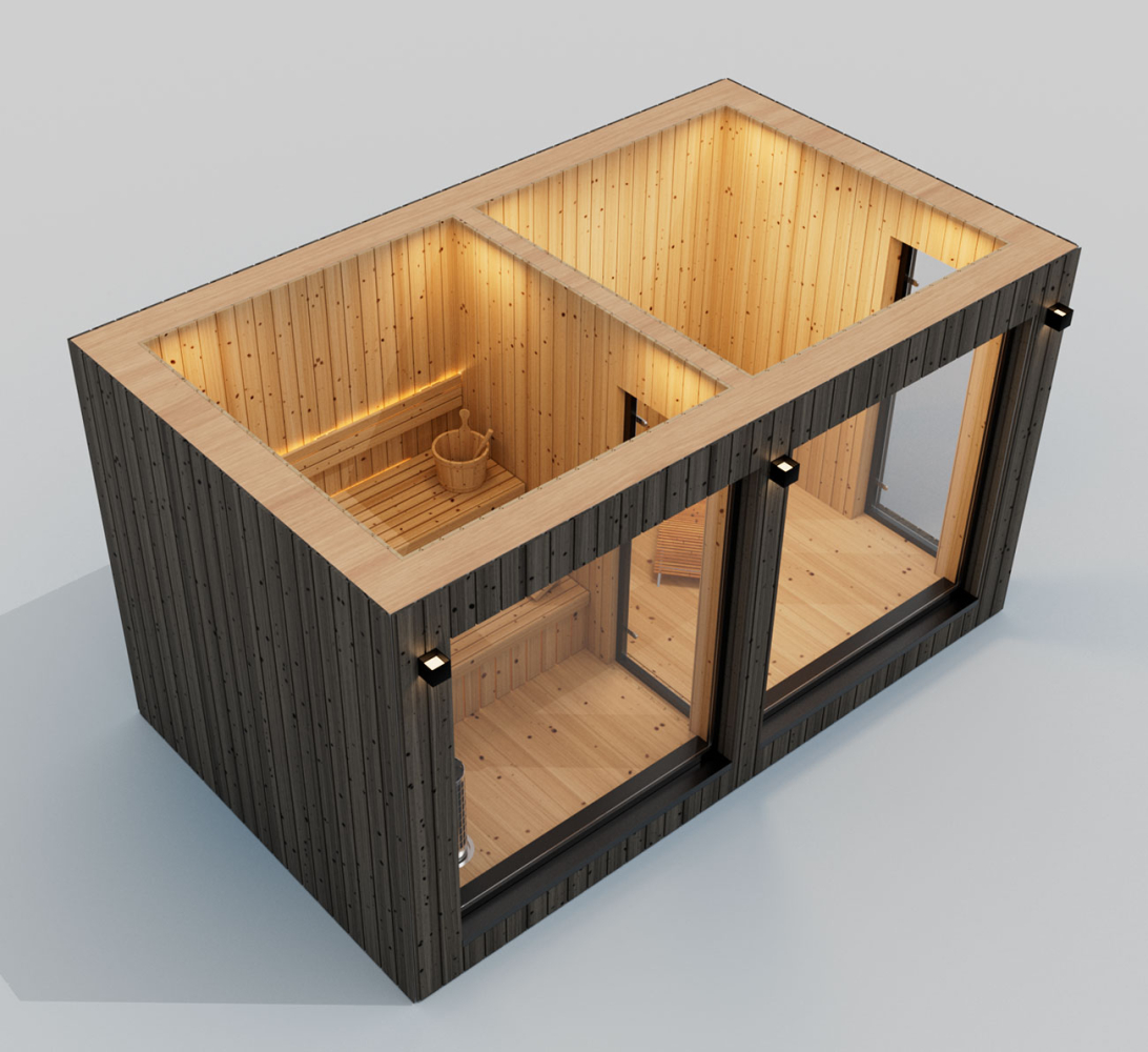 Saunování není jen o teple – je to rituál. A právě proto tato varianta nabízí kromě samotné sauny i odpočinkovou místnost, kde si můžete celý zážitek vychutnat naplno. Po intenzivním prohřátí těla přichází čas na klid, zpomalení a regeneraci. Relaxační prostor poskytuje ideální zázemí pro ochlazení, odpočinek nebo posezení s přáteli. Vše je navrženo tak, aby na sebe jednotlivé části přirozeně navazovaly a vytvářely harmonický celek.