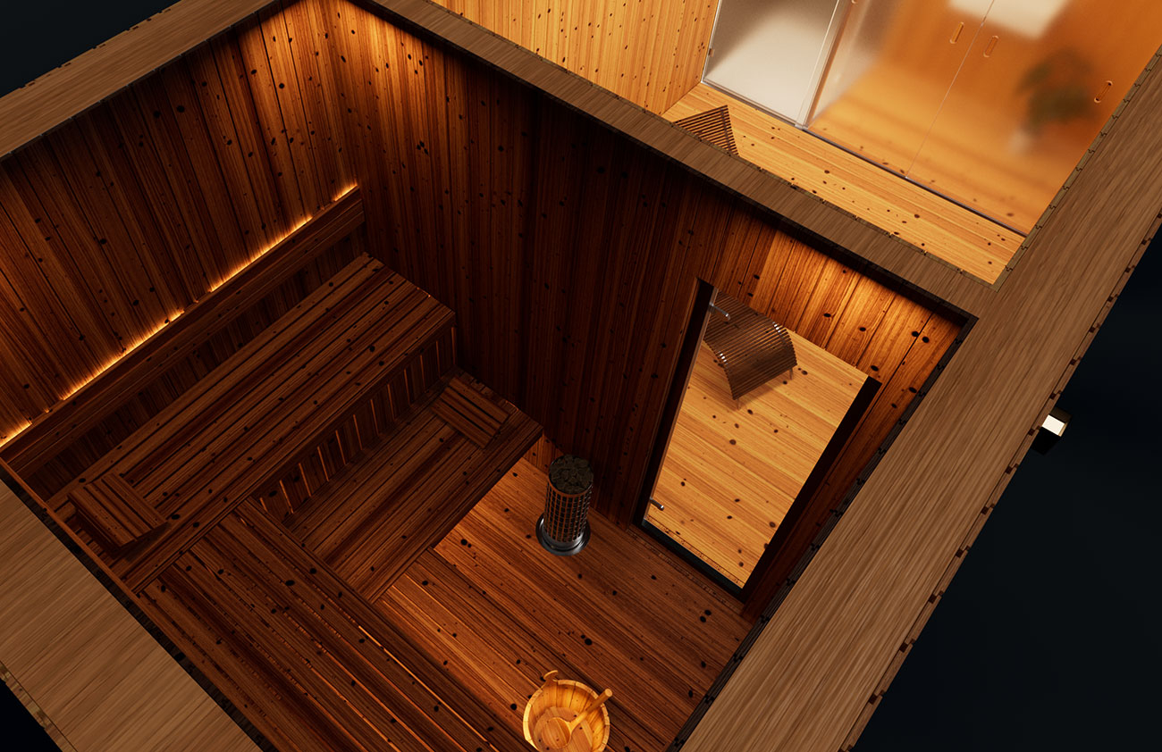 Nejvyšší úroveň komfortu a soukromí. Tato varianta přináší kompletní wellness řešení – saunu, odpočinkovou místnost i plnohodnotnou koupelnu v jednom celku. Díky vlastní sprše a zázemí není potřeba nic řešit ani plánovat. Můžete plynule přecházet mezi jednotlivými fázemi saunování přesně tak, jak to má být – zahřátí, ochlazení, odpočinek. Ideální řešení pro náročnější uživatele i větší rodiny.